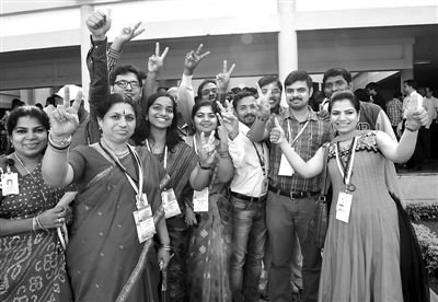 9月24日,在位于班加罗尔的印度外太空研究组织指挥中心,印度科学家庆祝火星探测器成功入轨。