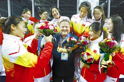 9月24日,中国队夺得亚运会女子水球比赛冠军,队员在颁奖仪式结束后把金牌都挂在了主教练阿泽维多·里克脖子上。 新华社记者 沈伯韩 摄