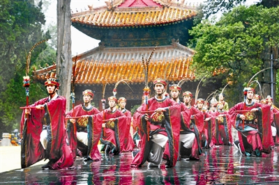 9月28日,孔子故里山东曲阜孔庙举行祭孔大典,祭祀人员在表演祭孔舞乐。