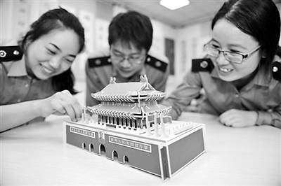 ②“融入指尖赤子爱 ,汇聚心中爱国情”。国庆节前夕,郑州北站职工以多种形式表达对祖国的热爱,感恩幸福生活。图为青工在拼装天安门模型,献上对伟大祖国的美好祝福。霍斌 康永继 摄