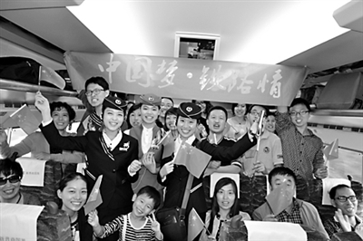 太原铁路局太原客运段在国庆节期间开展了“迎国庆、保安全、创优质”主题实践活动。图为5307太原南开往运城北的列车乘务员为旅客献歌,博得了旅客阵阵掌声。