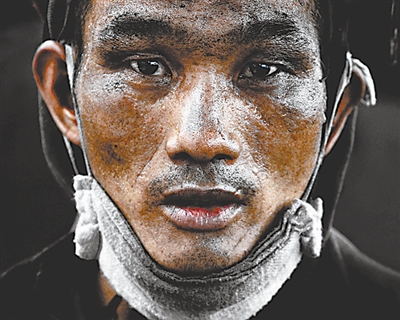本届大赛一等奖获得者胡宝河的作品《七月的肖像》,只是锁定了一个人物的面部肖像便紧紧抓住了参观者的心。作品拍摄了一个于炎炎夏日里仍旧在煤矿作业的工人,棱角分明的脸颊上,汗珠混夹着煤灰肆意流淌,却并没有被擦拭的痕迹,白口罩也被黑色的汗珠染成了墨色,不知是否因为矿井下太闷,口罩被拽到了下巴之下。“如果没有切身的感受,你不会对他们报以如此炽热的情感。”在江苏一家企业工作的胡宝河对记者说。