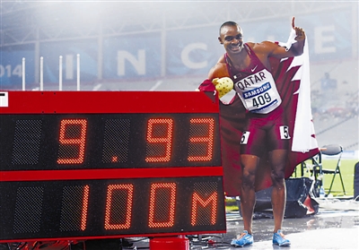 卡塔尔选手奥古诺德在以9秒93夺得冠军的同时,也将同胞弗朗西斯保持了7年之久的9秒99的亚洲纪录缩短了0.06秒。值得一提的是,弗朗西斯和奥古诺德都来自于非洲国家尼日利亚。