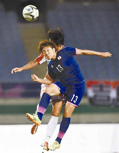 10月1日晚,在仁川亚运会女足决赛中,朝鲜队3比1力克世界冠军日本队,夺得金牌。图为双方球员头球争顶。CFP供图