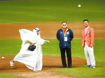亚奥理事会主席艾哈迈德亲王(左)亚运期间亲自下场试投棒球,其“亲民路线”获得了众多赞誉。本报记者 郎成 摄