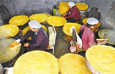 金秋时节,山东省沂源县的煎饼加工企业加紧加工用新粮食做成的各类煎饼,供应各地市场。煎饼,是沂蒙农村传统家常主食,也是久负盛名的地方土特产食品。近年来,山东省沂源县的一些农民通过注册煎饼品牌,成立起“煎饼合作社”、“煎饼研究所”等方式,以农户分散手工加工、企业统一回收、集中销售的企业化运作模式,将这一传统美食做成增收致富的大产业。目前,全县煎饼加工企业达到200余家,从业农民达到5000余人,所加工的各类煎饼远销各地。 新华社发 赵东山 摄