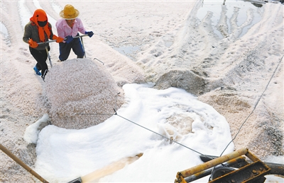 10月9日,江苏连云港市,江苏金桥盐化集团徐圩盐场新滩工区工人在收获原盐。