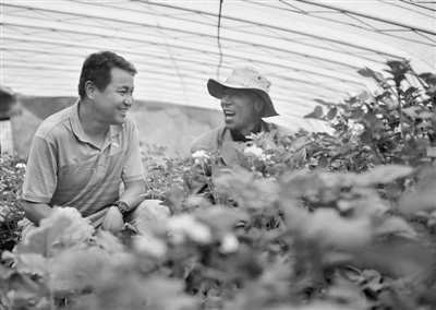 图为西藏日喀则地区昂仁县卡嘎镇欧村驻村工作队员丹洛(左)在大棚内和种植户达娃次仁交谈。