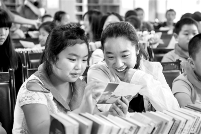10月12日,一名留守儿童和牵手帮扶她的大学生志愿者(右)进行交流。