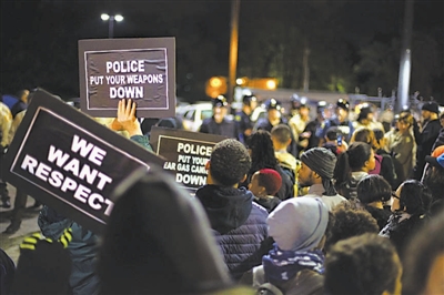 当日,几百名示威者聚集在密苏里州圣路易斯市弗格森警察局旁,纪念两个月前被白人警察射杀的18岁黑人青年迈克尔·布朗,以及该市其他被警察枪杀的黑人青年,抗议普遍存在的警察暴力执法问题。 新华社发(戴恩·岩田摄)