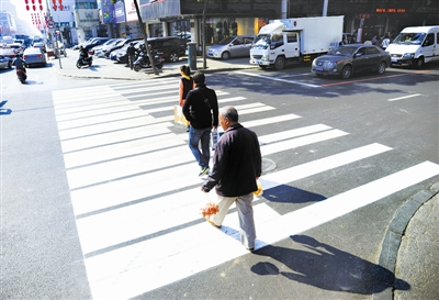 10月14日,沈阳七路兴顺街路口,行人走在“钢琴键”斑马线上。