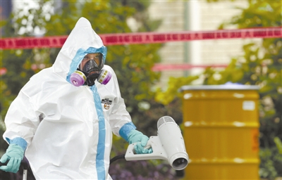 12日,美国达拉斯,一名工作人员全副武装,在尼娜的住所外进行清洁。东方IC供图