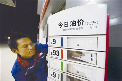10月18日凌晨,河北保定一家加油站的工作人员在调整新的油价公示牌。
