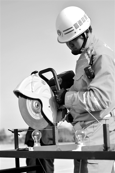10月19日,参赛选手进行应急救援金属切割项目的比赛。