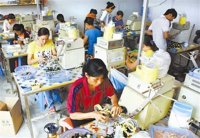 10月18日,工人在黄国君的加工厂里生产高频变压器。