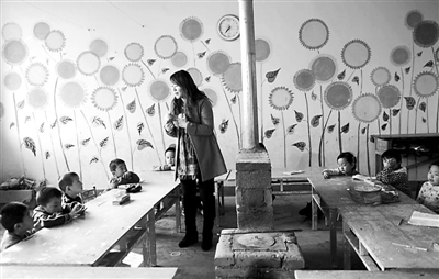 10月20日,王小静在给孩子们上课。王小静是河北省隆化县中关镇前中关村幼儿园唯一的一名教师,负责11个孩子。