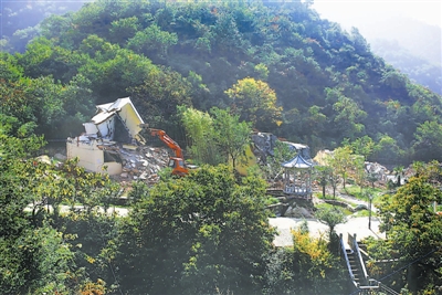 10月21日,西安市长安区滦镇石峡沟村。隐藏在山中的违建别墅,很多已经人去楼空,这里将恢复原貌。当日,3台挖掘机开始拆除这些违建,按计划,8栋违建在当日被拆。这是长安区首批集中拆除违建。