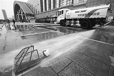 10月21日,第五届宁波市市容环卫行业职业技能大赛举行,参赛选手驾驶洒水车通过车尾喷水射球进门的比赛吸引了众人围观,展现了宁波环卫工人的风采。图为驾驶员驾驶冲洗车把球冲进球门里。