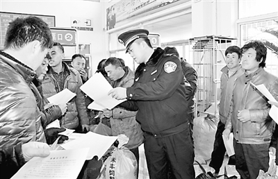 图为丹东铁路民警在向农民工宣传安全常识。(刘嘉辰 贾勇)