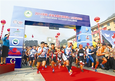 由中共武安市委、武安市人民政府和中国民族报社主办,邯郸市体育局、邯郸市旅游局协办的2014邯郸·武安全国划骑跑铁人三项挑战赛日前落幕。本次比赛吸引了近400名专业和业余选手参加。图为选手出发瞬间。