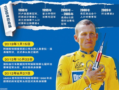 因为使用兴奋剂让运动“神话”破灭的事例,在其他体育项目中也不少见——曾被视为“命运斗士”的美国自行车名将阿姆斯特朗,因为服用禁药被剥夺所获7届环法赛冠军头衔并遭终身禁赛;昔日“网坛公主”辛吉斯,在2007年曾因温网药检呈阳性而被迫退役;2013年,NBA球星特科格鲁因药检不过关被联盟禁赛……