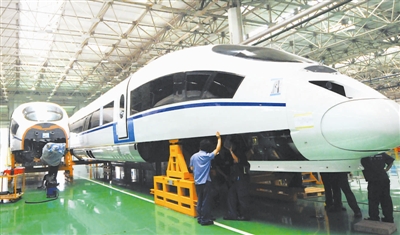 图为中国北车唐山客车公司时速350公里动车组总装配生产线。