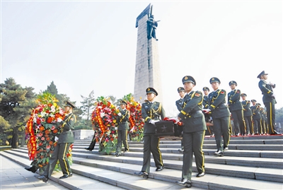 10月29日,在韩志愿军烈士遗骸安葬仪式在沈阳抗美援朝烈士陵园举行。3月28日迎回的437位在韩志愿军烈士的遗骸被安葬在沈阳抗美援朝烈士陵园下沉式安葬地宫。沐影 摄/CFP