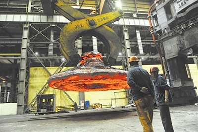 10月27日,中信重工机械股份有限公司为德国孟克公司(MENCK)成功锻造毛重达438吨的海洋水下液压打桩核心部件砧子,标志着中信重工成功进入国际高端海工装备市场。图为18500吨油压机锻造现场。