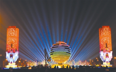 10月30日晚,北京,奥林匹克公园中轴线南端,新亮相的APEC会徽及周边景观开始试灯,营造出绚丽多彩的喜庆氛围,迎接即将召开的APEC会议。