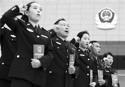 10月29日,在江苏省淮安市盱眙县公安大楼前,当选盱眙“我最喜爱的人民警察”称号的10名优秀警察庄严向宪法宣誓。当日,经过推荐、投票、演讲、考核等环节,持续两个月的江苏盱眙“我最喜爱的人民警察”评选活动落下帷幕。10名在打击犯罪、服务群众和维护当地社会治安稳定中做出突出成绩的优秀警察当选。新华社发 (周海军 摄)