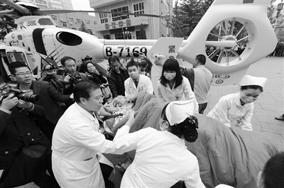 2014年10月30日,北京红十字会999急救中心中国首家专业医疗救援直升机载着一名紧急转运至京的重度患者降落在解放军307医院。这是国内首架专业医疗救援直升机成功转运患者的首个案例。同时,首个空中紧急救援保险在10月29日起销售,最低每年花299元就可打急救“飞的”,市民可通过微信购买。亿佰/CFP