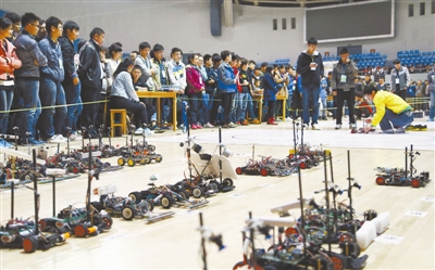 11月1日,山东省高校第三届机器人大赛在山东省青岛市中国石油大学(华东)举行。山东省20多所高校、千余名师生、近300台功能各异的机器人分别参加双足竞步、同步机器人、避障避险小车、灭火机器人、自选项目等5类比赛。图为机器人“双足竞步”比赛现场。