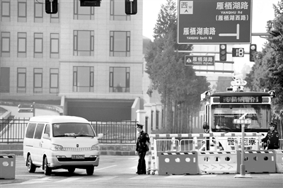 图为雁栖湖东门,武警在执勤。