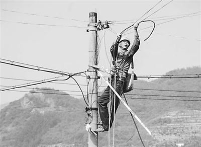 10月下旬,杭州市余杭区的仙佰坑村30多亩水稻进入收割季节,丰收在望。来自当地电力部门的20多名工作人员将村里的农用供电线路和用电设施进行改造,确保秋收季节的电力安全。图为余杭供电公司工作人员在架设新的农用线路。