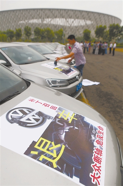 图为10月26日,广东惠州的20多名车主开着速腾车来到奥林匹克运动场集体维权,就一汽大众对问题车辆在后轴上“打补丁”的召回方式表示强烈的不满。