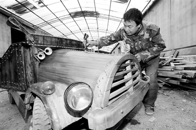 沈阳:木匠造出木质电动轿车 时速可“飙”30公里