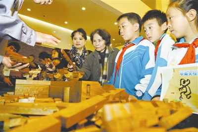 11月4日,建筑学家梁思成的女儿梁再冰(右四)与学生们一起观看古建筑模型搭建。当日,位于北京的国家典籍博物馆举行“走进典籍博物馆大课堂”系列活动启动仪式,近200名中小学生走进博物馆,了解学习中国建筑思想和文化传统。这是国家典籍博物馆利用展览和专家资源,与学校教育相结合的一项尝试。 新华社记者 潘思危摄