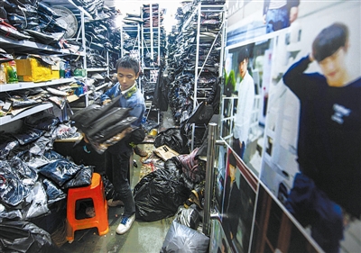 11月8日晚,一名网店工作人员在杭州四季星座大厦一家淘宝服装批发商铺拿货。“双十一”网络购物高峰即将到来,浙江杭州网店密集的四季星座大厦内众多网店工作人员连夜备货发货。因毗邻杭州四季青服装批发市场,20层的四季星座大厦内有600多家商户,主营网络男装。