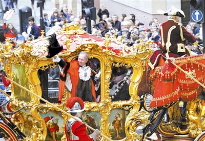11月8日,在英国首都伦敦,新当选的伦敦金融城第687任市长艾伦·亚罗(中)在一辆有257年历史的金色马车上向观众致意。