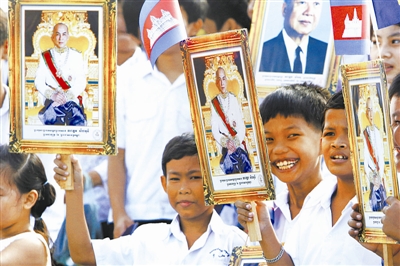 11月9日,在柬埔寨首都金边,学生手举西哈莫尼国王的肖像参加独立日庆祝活动。