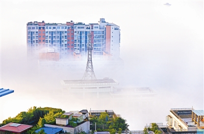 11月11日早晨7时许,四川成都城区南面出现“平流云”景象,大片楼宇被雾气笼罩,宛如“海市蜃楼”。新华社记者 李桥桥 摄