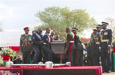 11日,在赞比亚首都卢萨卡,士兵抬着赞比亚已故总统迈克尔·萨塔的灵柩准备下葬。当日,萨塔的葬礼在卢萨卡国家英雄体育场举行,多个非洲国家元首出席了葬礼。随后,萨塔的遗体被安葬在“大使馆公园”内。 新华社记者 彭立军 摄