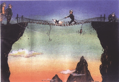 导盲犬引领主人走近危桥,他们不顾别人的嘲笑,心无旁鹫地到达彼岸。胜利,意味着执著、勇敢的登攀精神。