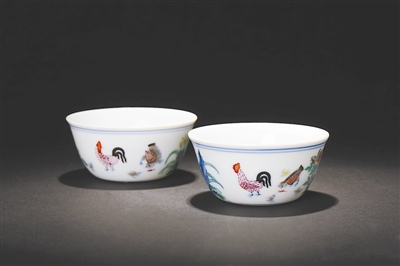 1949年前后,香港收藏家仇炎之用1000元港元,买下了一对被许多人认为是“假货”的明成化斗彩鸡缸杯。据赵汝珍著的《古玩指南》记载:“明成化窑斗彩鸡缸杯,现存仅三只。”成化斗彩瓷器,基本上都是官窑产品,在明代已获得了极高的评价。郭子章《豫章陶志》说:“成窑鸡缸杯为酒器之最。”清朱琰《陶说》记载:“成窑以五色为最,酒杯以鸡缸为最,神宗时,尚食御前,成杯一只值钱十万。”清代大收藏家高江村的《成窑鸡缸歌注》记载:“成窑酒杯,各式不一,皆描画精工,点色深浅,莹洁而质坚,鸡缸,上画牡丹、下画子母鸡,跃跃欲动。”清代乾隆皇帝尤喜鸡缸杯,在御题仿古鸡缸杯诗中,吟诵道:“寒芒秀采总称珍,就中鸡缸最为冠。”将斗彩鸡缸杯,尊为成化制瓷中的最成功之作。乾隆不仅让当时的景德镇御窑仿制,还亲自题诗作志,使清代仿明成化斗彩鸡缸杯风靡一时。
