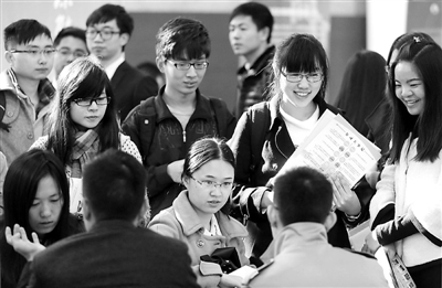 11月15日,大学生们在招聘会上与用人单位洽谈。当日,来自各地的212家用人单位走进南京东南大学九龙湖校区,参加该校举办的2015届毕业生大型招聘会,提供4000余个工作岗位招揽人才。眼下,不少企业主动出击走进高等院校,期待选择到更多优秀人才。泱波 摄/中新社