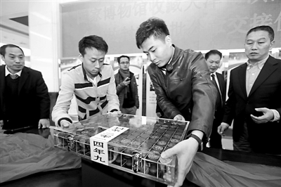 11月15日,天津,国家博物馆收藏天津滨海新区“109枚封存审批公章”交接仪式在滨海新区行政审批局举行。滨海新区行政审批局挂牌成立至今已经近半年时间,通过用一颗印章取代过去109颗印章的行政体制改革,审批速度提高了80%。“109枚封存审批公章”被国家博物馆永久收藏后,成为政府简政放权的历史文物。图为工作人员搬走作废公章。付阳 摄/CFP