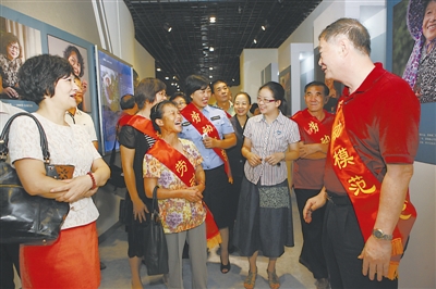 劳模参观劳模“百人百像”摄影展。这是劳模看见自己图片时开心的情景
