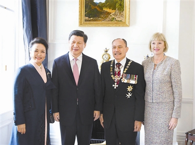 11月20日,国家主席习近平在惠灵顿出席新西兰总督迈特帕里举行的欢迎仪式。这是欢迎仪式后,习近平和夫人彭丽媛同迈特帕里夫妇合影。 新华社记者 李学仁 摄