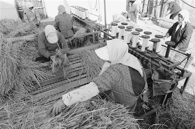 江苏连云港赣榆区实施秸秆综合利用富民增收工程,鼓励和引导农民利用当地丰富的稻草资源进行编织加工,每年消耗稻草150万吨,产值达4亿多元。原来无人问津、经常被一烧了之并造成空气污染的小小秸秆,如今成为当地农业增效、农民增收致富的“金条”。图为农民利用废弃的稻草秸秆在加工草帘。耿玉和 摄