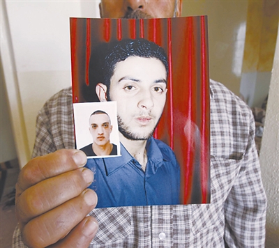 当地时间11月18日,一名巴勒斯坦人出示当天行凶的巴青年照片,乌代·阿布·贾马尔(左)和加桑·穆罕默德·阿布·贾马尔(右)。